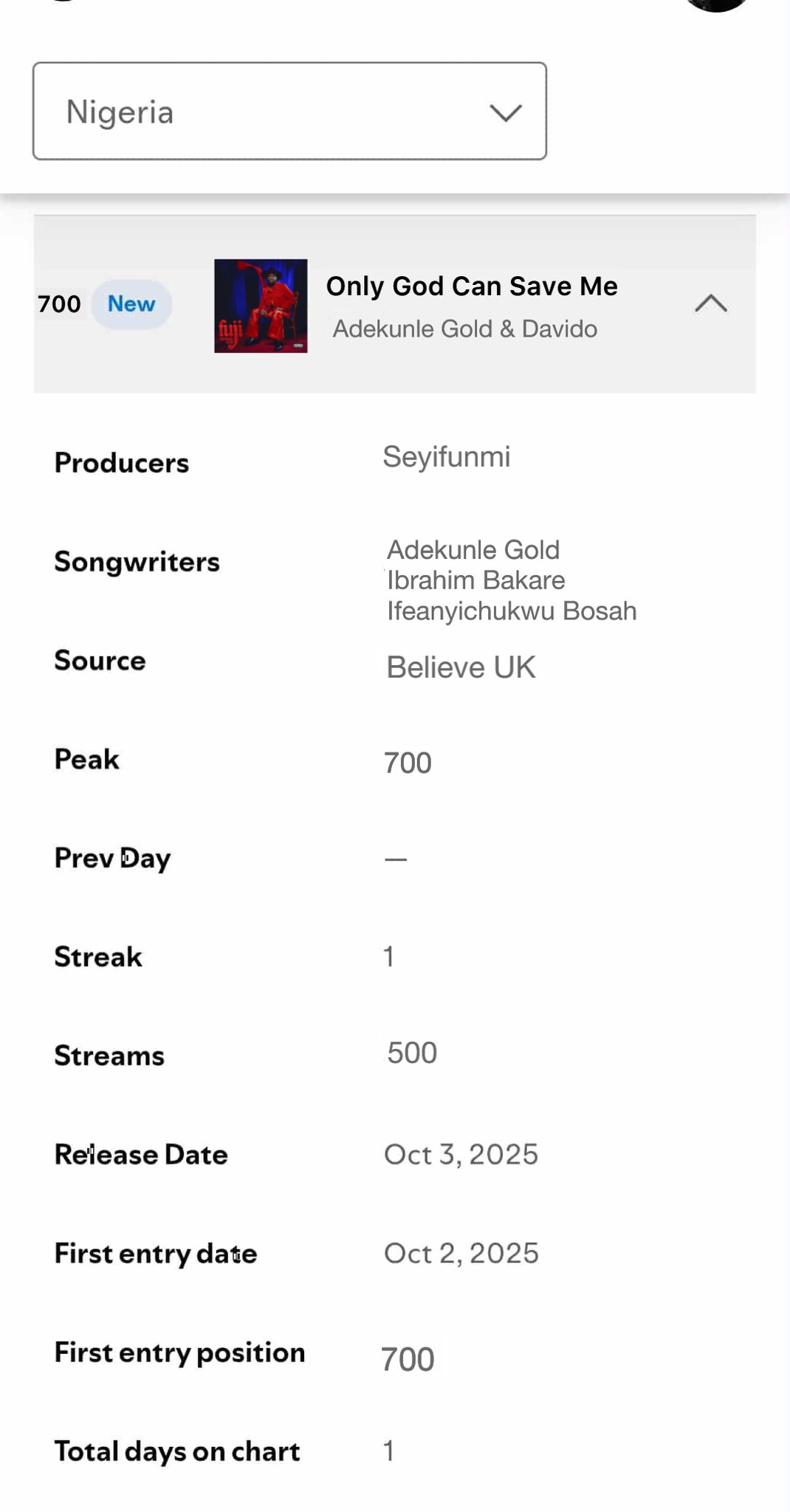 But the debut numbers told a different story. On October 3, 2025, reports surfaced showing the song entering Spotify Nigeria's chart at a shocking No. 700 position. Even more eyebrow-raising? It garnered just 500 streams in the first hour of tracking.