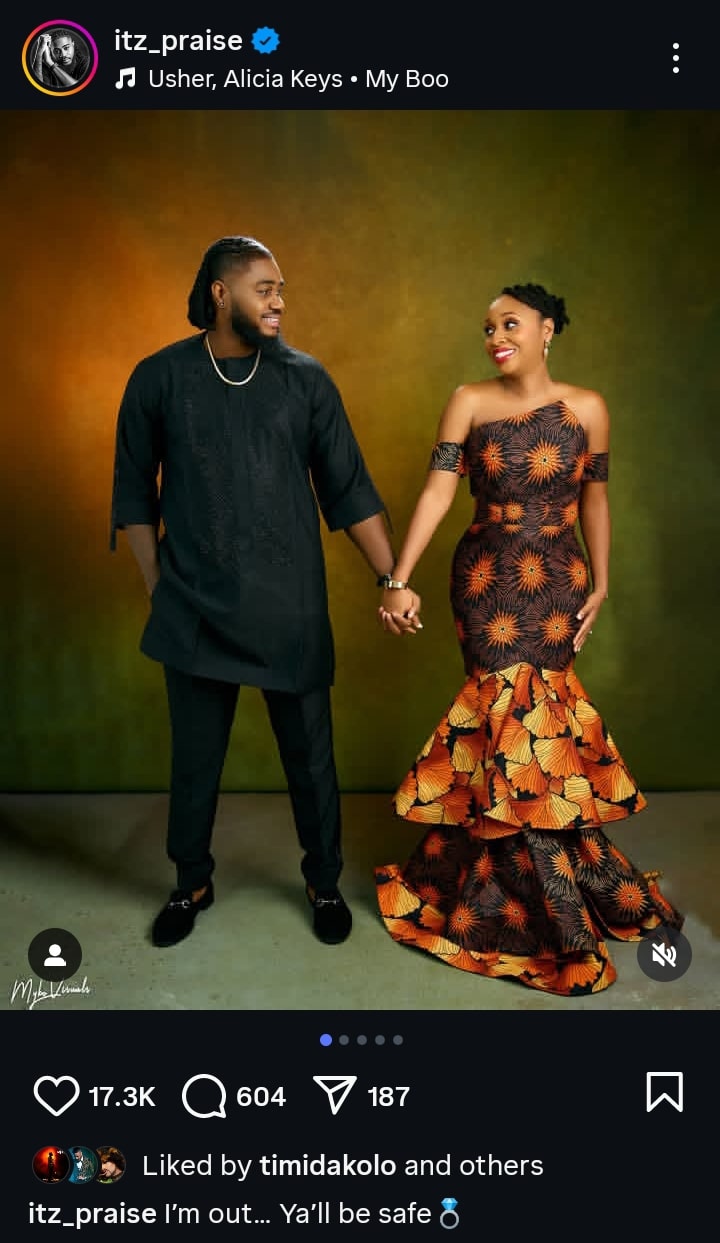 The 28-year-old dancer and fitness instructor from Enugu shared stunning pre-wedding photos on his Instagram page, featuring himself and his fiancée in coordinated outfits. His caption, “I’m out… Y’all be safe,” humorously signaled that he is officially off the market, prompting a flurry of responses from fans and followers.