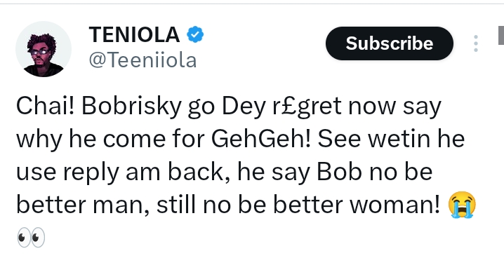 Fans were quick to pick sides. Some defended Bobrisky, pointing out his influence and ability to trend at will, while others cheered GehGeh for saying what they felt many had long been thinking. The online back-and-forth didn’t just spark laughter; it reignited broader conversations about fame, authenticity, and the blurred lines in Nigeria’s entertainment industry.