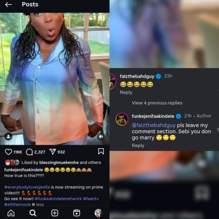 Amid the trending gist, Falz playfully dropped a comment under Funke Akindele’s latest post, but the actress wasn’t having it. She quickly fired back, telling him to leave her comment section, a reaction that immediately caught the attention of fans.
