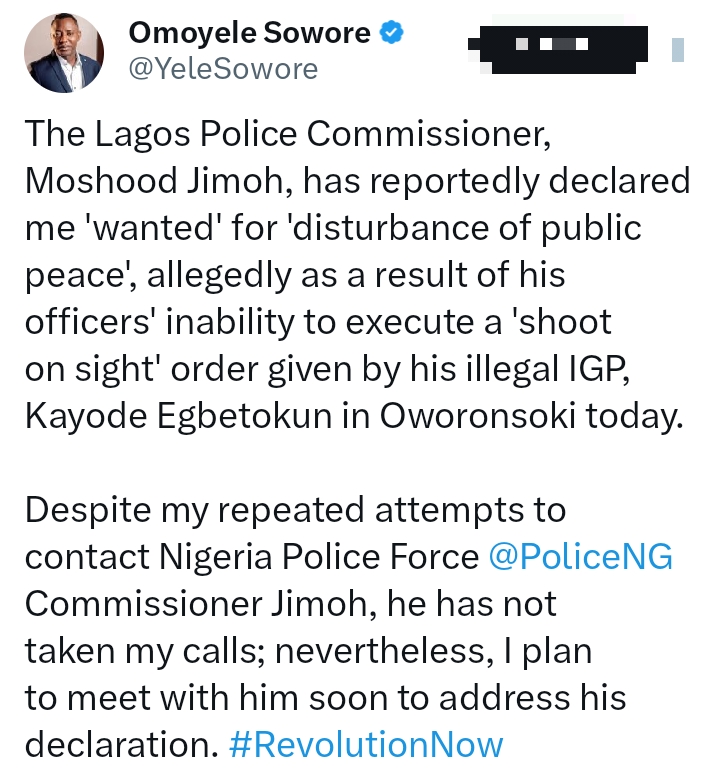 “Omoyele Sowore is wanted,” he declared, voice steady, eyes scanning the horizon. “Report to the nearest station. We are closing in.”