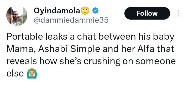 In the alleged chat, Ashabi appeared to be confiding in a cleric identified by several outlets as Alfa Hamod Eni Nla. She was said to have poured out her heart, claiming she had fallen for another man named Kenny Hussein. According to the screenshots, she expressed how difficult it was to move on with her feelings while still tied to Portable, her baby daddy. The messages reportedly carried emotional tones of confusion and regret, the kind that got readers hooked immediately.