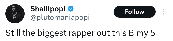 It all started on October 16, 2025, when Shallipopi, whose real name is Crown Uzama, took to X with a cryptic post: "Still the biggest rapper out this B my 5." Fans decoded it as a self-proclaimed throne grab in the rap game, but not without controversy. The artist, known for his "Pluto" sound - a fusion of Afrobeats, street-pop, and trap has repeatedly shrugged off the rapper label in past interviews, calling his style something entirely unique.