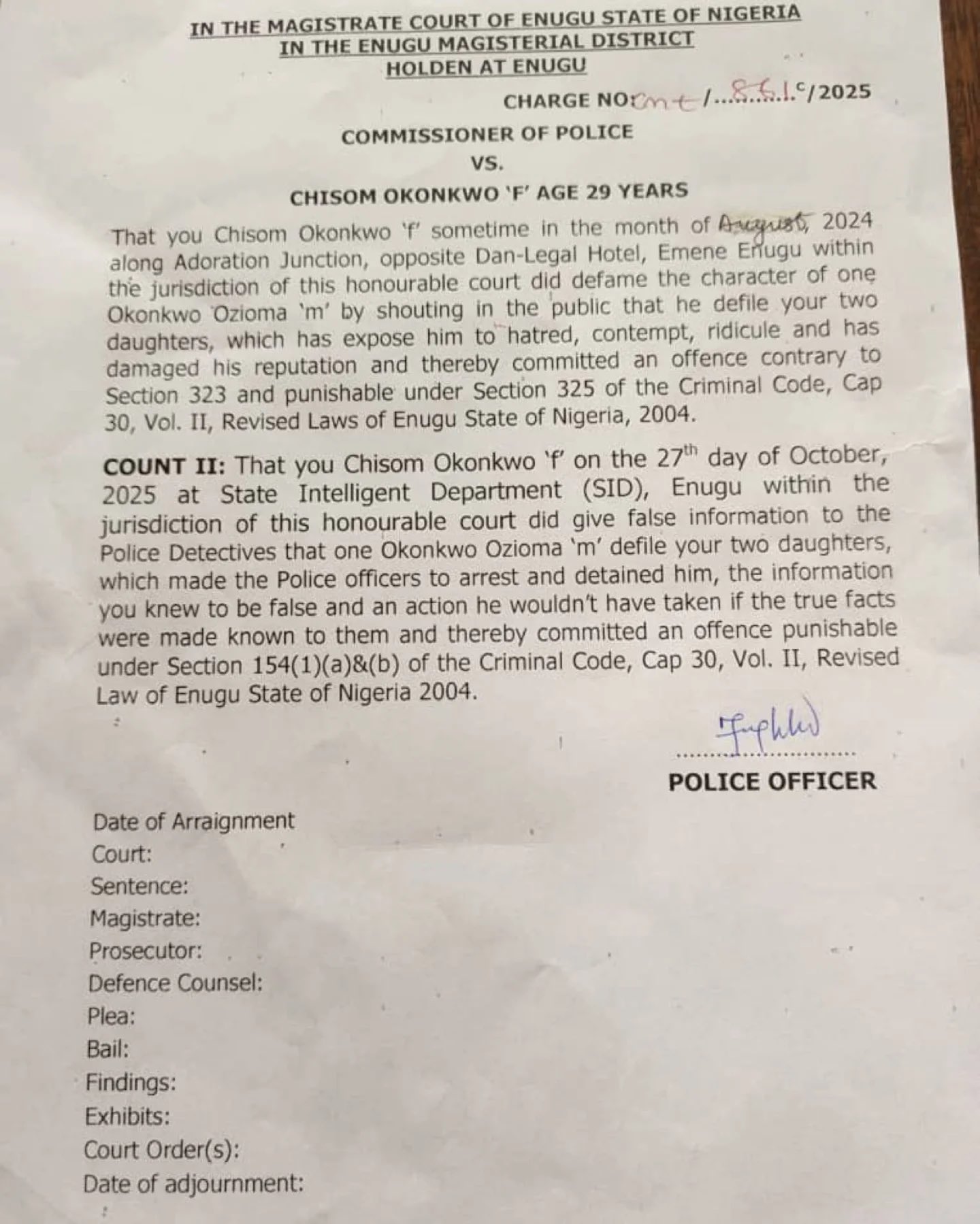 Karma, or justice, struck back on November 11, 2025. Chisom appeared before the Enugu Magistrate Court, hit with two counts under the Criminal Code. The first: defamation for her public smear, punishable under Section 325, that invited ridicule and contempt. The second: misleading police with falsehoods under Section 154, sparking his wrongful detention. Case CM/861c/2025 now hangs over her, a police-filed warning against weaponizing lies.