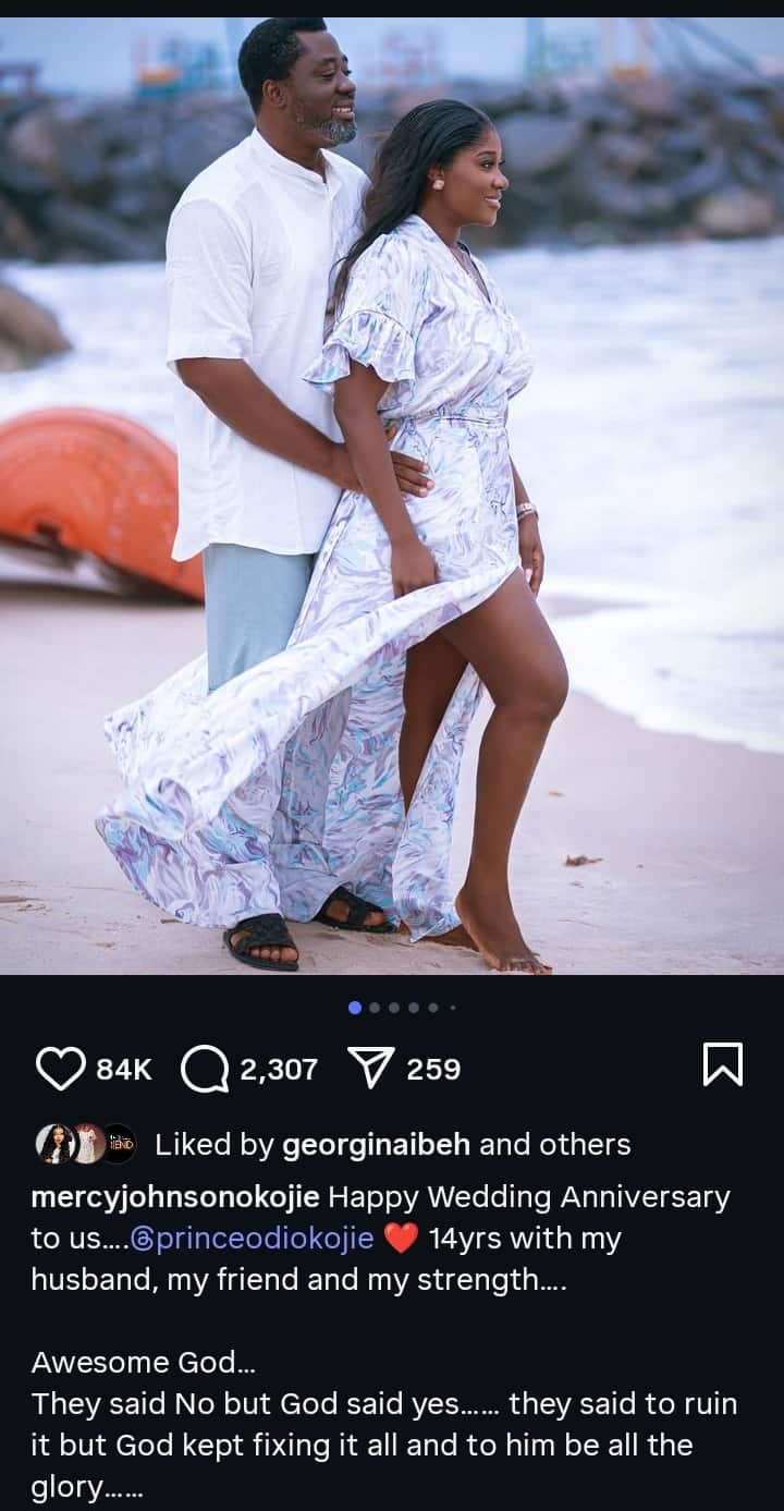 Nollywood actress Mercy Johnson-Okojie and her husband, Prince Odianosen Okojie, are marking 14 years of marriage with gratitude and faith as the foundation of their union.