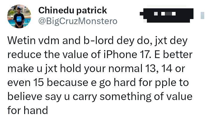 The drama has spilled beyond the duo. Actress Nkechi Blessing dunked her ₦3 million iPhone 17 in water to prove its authenticity, only for VDM to show a refurbished XR surviving the same test. A cheeky entrepreneur even advertised a “Tecno 17 Pro” for ₦150,000, mocking the saga.